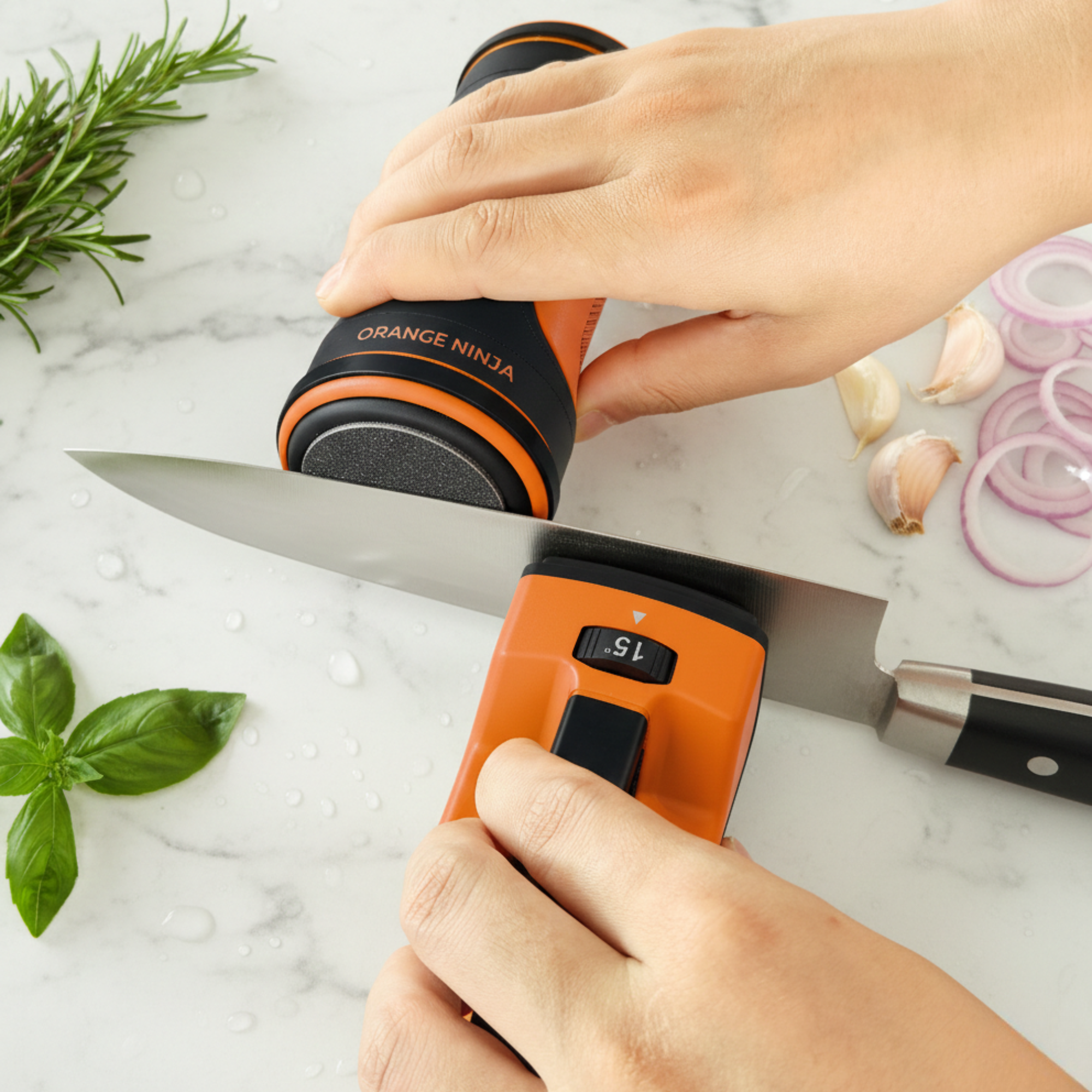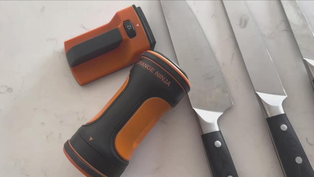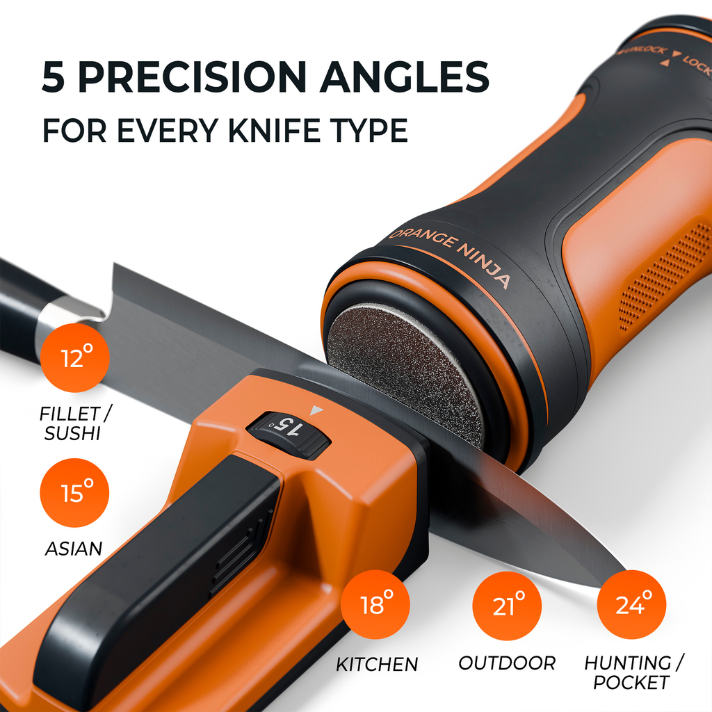 Yes. Unlike "one-size-fits-all" sharpeners that ruin delicate edges, our 12°–24° adjustable dial allows you to calibrate the exact factory angle for your specific collection. Whether you own high-end Japanese steel like Shun and Global or robust Western brands like Wüsthof, the Orange Ninja preserves your blade’s unique geometry.