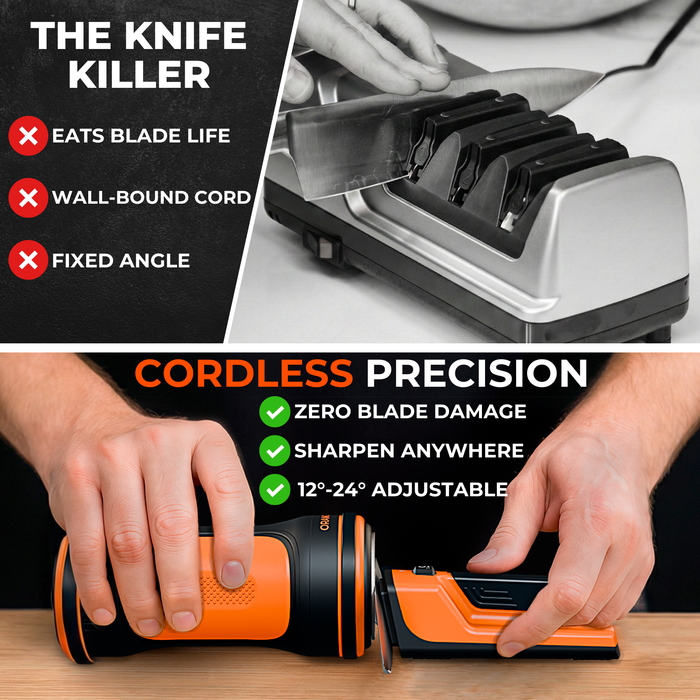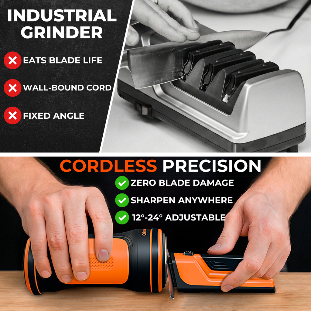 Traditional electric sharpeners are "knife killers" that grind away your steel with excessive heat. Orange Ninja uses motorized, constant-RPM precision to restore your factory 12°–24° edge while preserving your blade’s life.