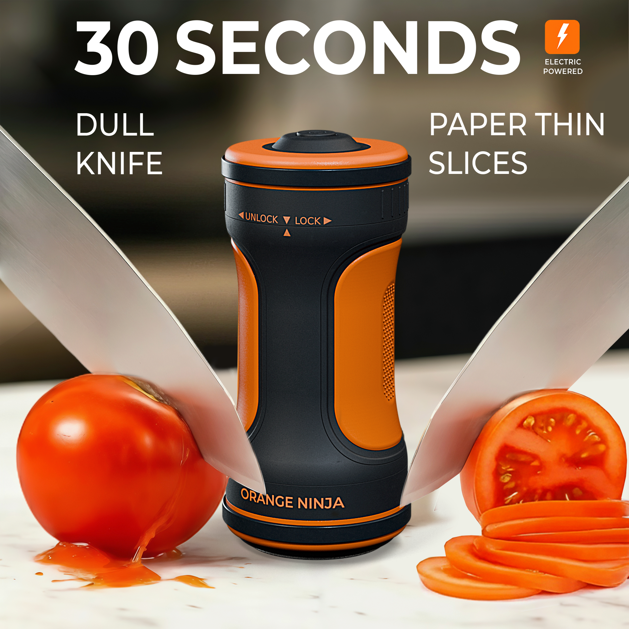 If your knife can’t slice a tomato into strips without pressure, it’s not sharp, it’s dangerous. The Orange Ninja’s Electric Rolling Knife Sharpener creates a surgical apex that restores your factory edge in under 30 seconds. No skill, no guesswork, just professional results.